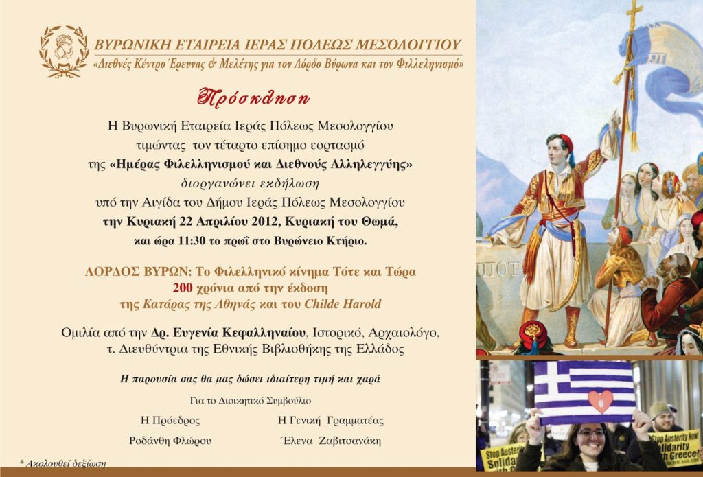 Η Βυρωνική Εταιρεία Ιεράς Πόλεως Μεσολογγίου τιμώντας τον τέταρτο επίσημο εορτασμό της “Ημέρας Φιλελληνισμού και Διεθνούς Αλληλεγγύης” διοργανώνει εκδήλωση, υπό την Αιγίδα του Δήμου Ιεράς Πόλεως Μεσολογγίου, την Κυριακή 22 Απριλίου 2012, Κυριακή του Θωμά, και ώρα 11:30 to πρωί στο Βυρώνειο Κτήριο.