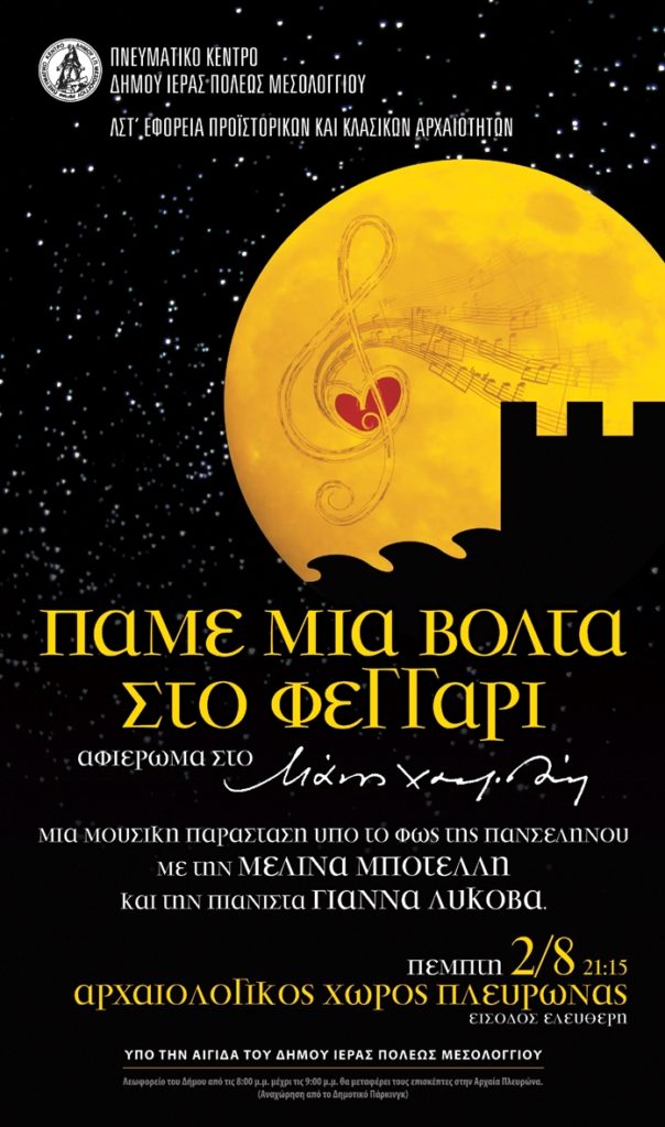 Στην Πανσέληνο της Πέμπτης, 2 Αυγούστου 2012 και ώρα 9.15 μ.μ. το Πνευματικό Κέντρο του Δήμου Ιεράς Πόλεως Μεσολογγίου και η ΛΣΤ΄ Εφορεία Προϊστορικών και Κλασικών Αρχαιοτήτων σας προσκαλούν, να παρακολουθήσετε στον Αρχαιολογικό Χώρο της Πλευρώνας τo μουσικό αφιέρωμα στο Μάνο Xατζιδάκι «Πάμε μια Βόλτα στο Φεγγάρι» με την Μελίνα Μποτέλλη και την πιανίστα Γιάννα Λύκοβα.