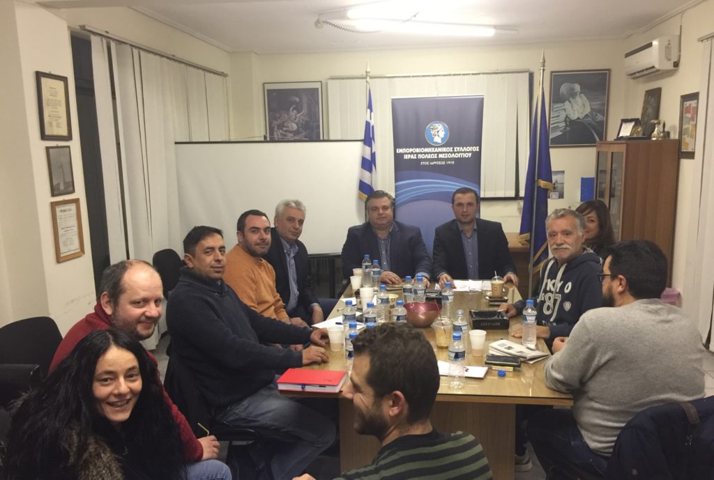 Με τον πρόεδρο Βασίλη Σπυρόπουλο και μέλη του Διοικητικού Συμβουλίου του Εμποροβιομηχανικού Συλλόγου Ιεράς Πόλεως Μεσολογγίου συναντήθηκε χθες ο Δήμαρχος Νίκος Καραπάνος. Η συνάντηση εργασίας έγινα στα γραφεία του συλλόγου.