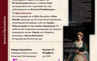Μια ζεστή, δημιουργική και ανοιχτή πρόσκληση προς μικρούς και μεγάλους απευθύνει η Κατεύθυνση Θεάτρου της Α’ Τάξης του Καλλιτεχνικού Γυμνασίου–Λυκείου Ι.Π. Μεσολογγίου, για την παρουσίαση του νέου βιβλίου της Φωτεινής Μυλώνα-Ραΐδη με τίτλο «Ο Χρυσοσπάθης», που θα πραγματοποιηθεί την Κυριακή 7 Δεκεμβρίου, στις 7:30 μ.μ., στο Κτήριο Χρυσόγελου. Το βιβλίο, [...]