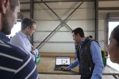 Ο πρωθυπουργός κατά την επίσκεψή του στην πρότυπη αγροτική μονάδα παραγωγής συνομίλησε με παραγωγούς και εργαζόμενους, εξήρε τη συμβολή του αγροτικού τομέα στην ανάπτυξη, και έδωσε ιδιαίτερη έμφαση στην πρωτοβουλία για τον ψηφιακό εκσυγχρονισμό του κράτους.