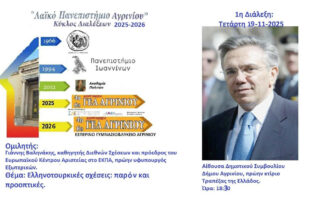 Με μια αιχμηρή παρέμβαση για την πορεία των ελληνοτουρκικών σχέσεων και την ανάγκη «νέας, έξυπνα διεκδικητικής στρατηγικής», ο Γιάννης Βαληνάκης μίλησε το βράδυ της Τετάρτης 19 Νοεμβρίου 2025 στο Αγρίνιο, ανοίγοντας τον νέο κύκλο διαλέξεων 2025-2026 του «Λαϊκού Πανεπιστημίου Αγρινίου». Η εκδήλωση πραγματοποιήθηκε στην αίθουσα του Δημοτικού Συμβουλίου Αγρινίου (πρώην [...]