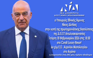 Την Αιτωλοακαρνανία θα επισκεφθεί την Τετάρτη 18 Φεβρουαρίου 2026 ο Υπουργός Εθνικής Άμυνας Νίκος Δένδιας, ο οποίος θα δώσει το «παρών» στην εκδήλωση για την κοπή της πρωτοχρονιάτικης πίτας της Διοικούσας Επιτροπής Εκλογικής Περιφέρειας (Δ.Ε.Ε.Π.) Νομού Αιτωλοακαρνανίας της Νέας Δημοκρατίας. Η εκδήλωση θα πραγματοποιηθεί στις 18:30, στο Corali Luxury Resort, [...]